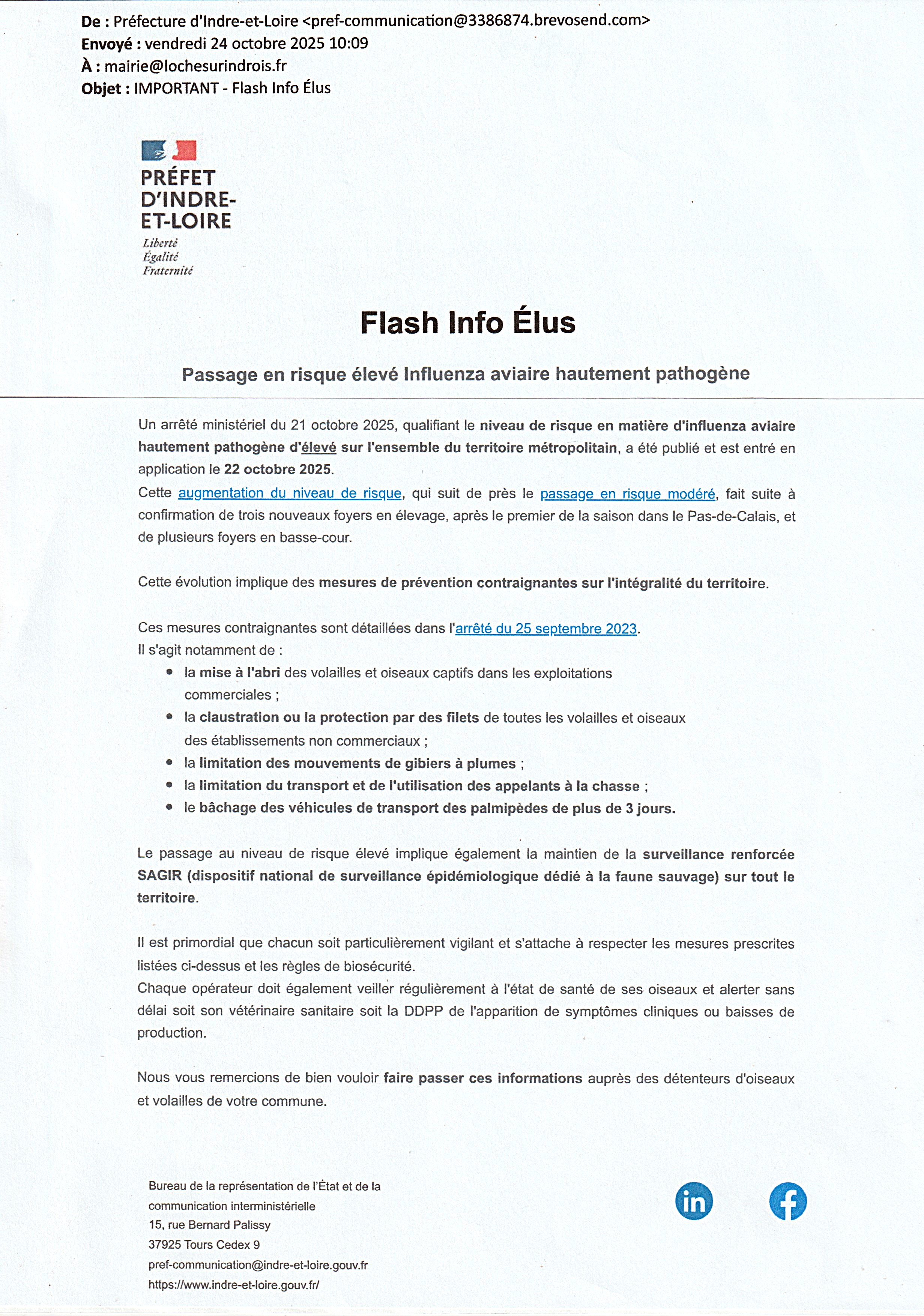 Arrêté Préfectoral concernant l'Influenza Aviaire